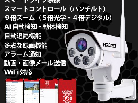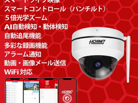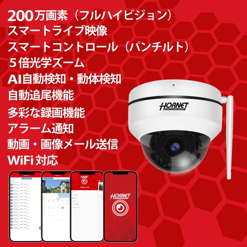 ホーネット防犯カメラは、AI自動検知・スケジュール・常時録画ができる防犯カメラです。専用アプリ「HORNET CAM」(無料)をダウンロードすることでスマートフォンから映像の確認再生、手動録画、カメラ操作、各種機能設定変更などができます。
