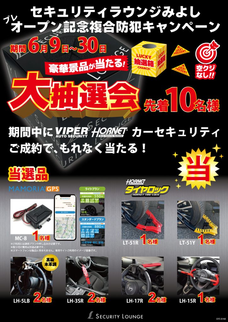期間中にHORNET/VIPERをご成約のお客様を対象に抽選(くじ引き)でもれなくセキュリティグッズが当たります!